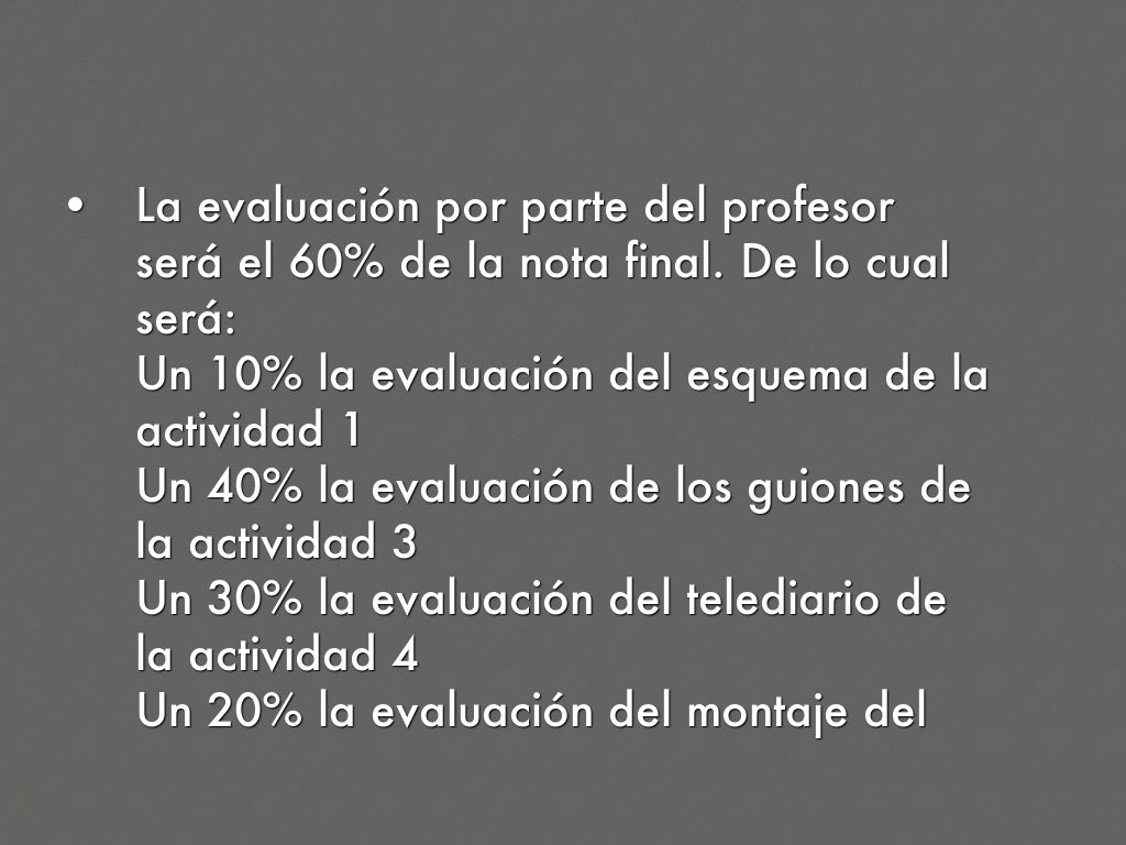 La evaluación por parte del profesor será el 60% de la nota final. De lo cual será: