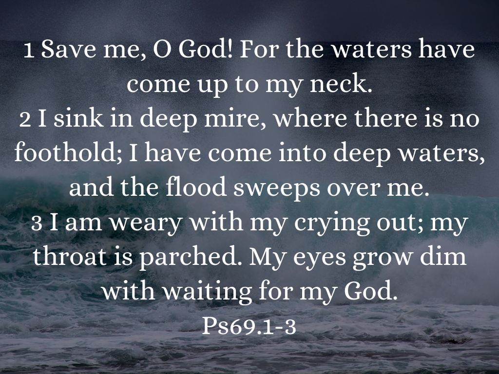1 Save me, O God! For the waters have come up to my neck. 2 I sink in deep mire, where there is no foothold; I have come into deep waters, and the flood sweeps over me. 3 I am weary with my crying out; my throat is parched. My eyes grow dim with waiting for my God. Ps69.1-3