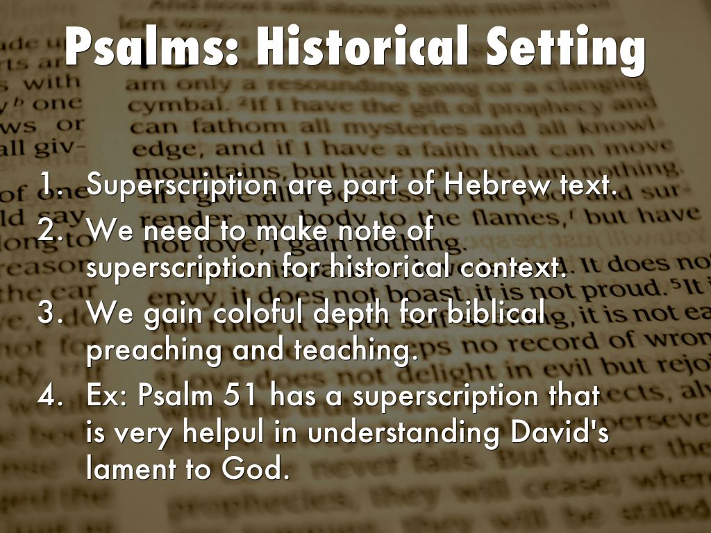 Ex: Psalm 51 has a superscription that is very helpul in understanding David's lament to God.