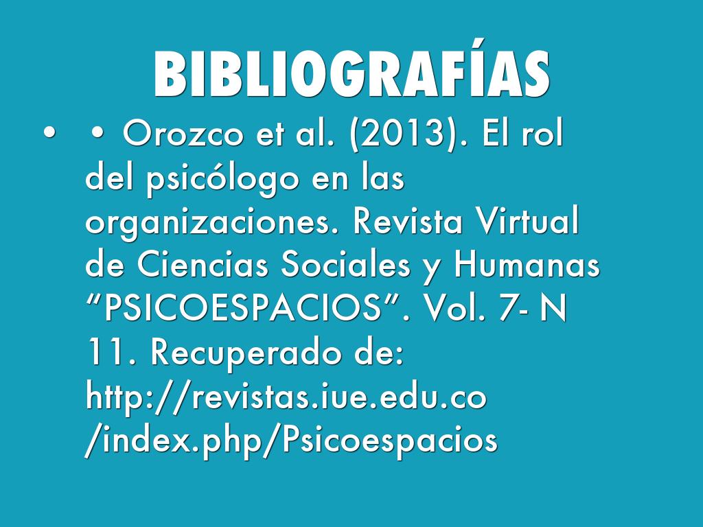 • Orozco et al. (2013). El rol del psicólogo en las organizaciones. Revista Virtual de Ciencias Sociales y Humanas “PSICOESPACIOS”. Vol. 7- N 11. Recuperado de: http://revistas.iue.edu.co/index.php/Psicoespacios