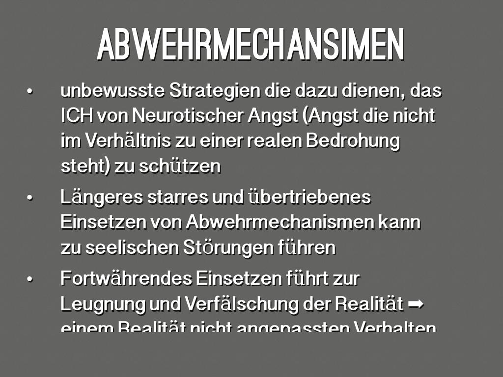 unbewusste Strategien die dazu dienen, das ICH von Neurotischer Angst (Angst die nicht im Verhältnis zu einer realen Bedrohung steht) zu schützen
