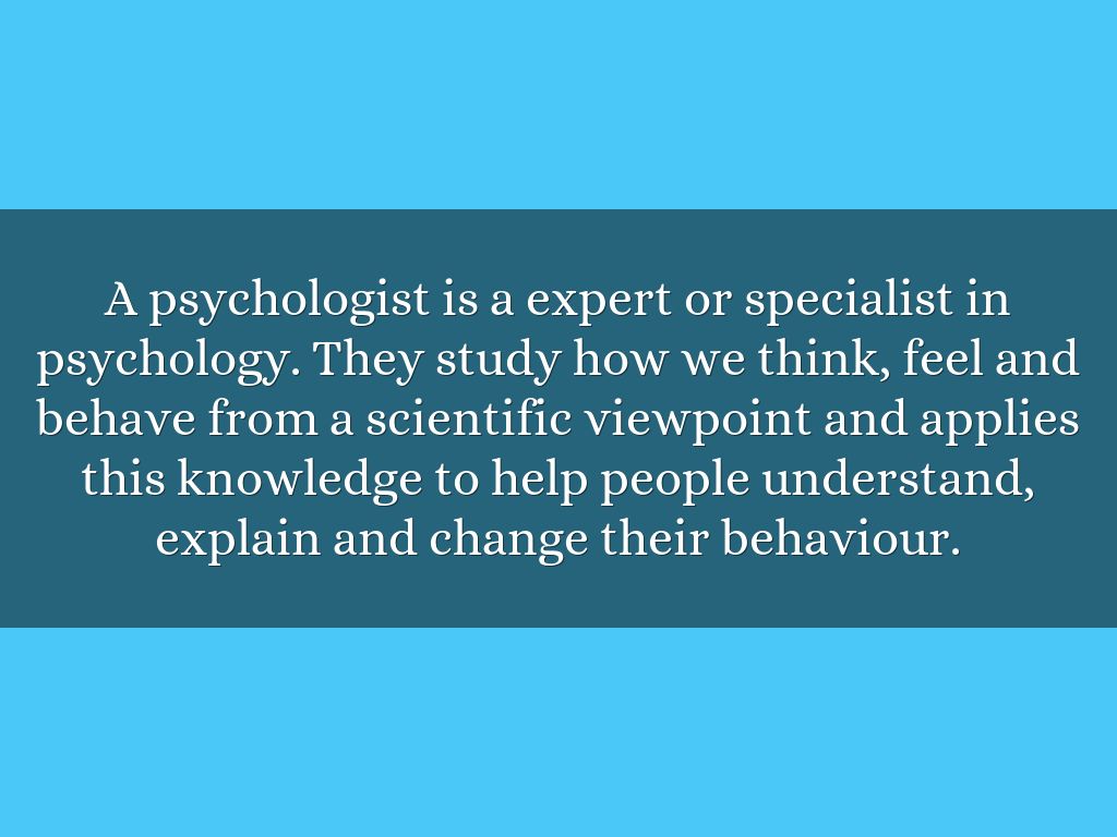 A psychologist is a expert or specialist in psychology. They study how we think, feel and behave from a scientific viewpoint and applies this knowledge to help people understand, explain and change their behaviour.