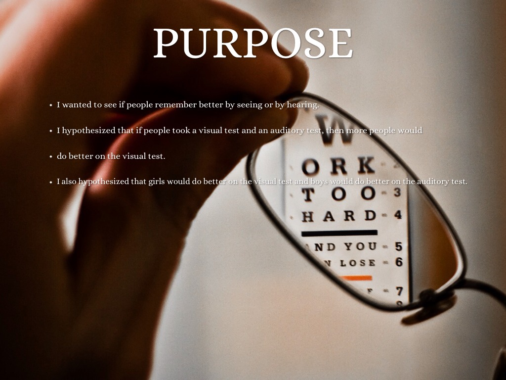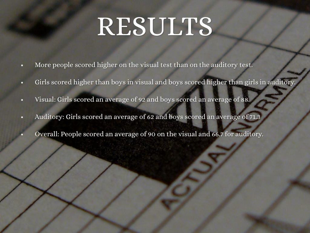 I also hypothesized that girls would do better on the visual test and boys would do better on the auditory test.