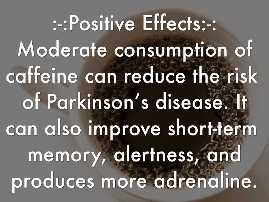 :-:Positive Effects:-: Moderate consumption of caffeine can reduce the risk of Parkinson’s disease. It can also improve short-term memory, alertness, and produces more adrenaline.