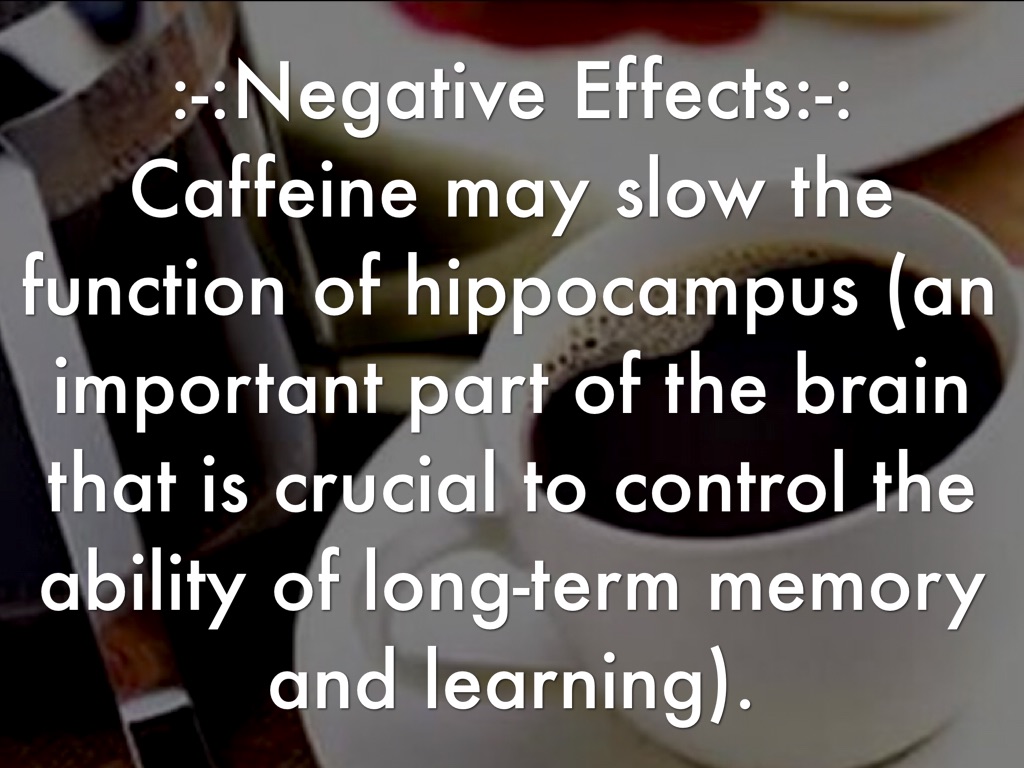 :-:Negative Effects:-: Caffeine may slow the function of hippocampus (an important part of the brain that is crucial to control the ability of long-term memory and learning).
