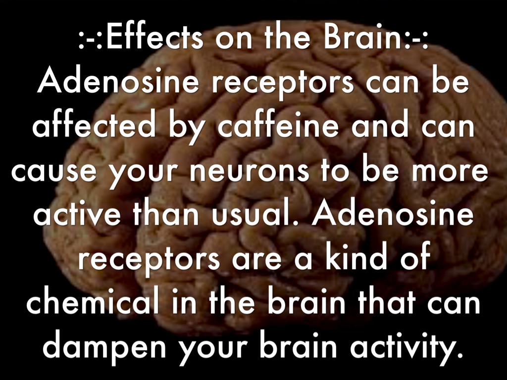 :-:Effects on the Brain:-: Adenosine receptors can be affected by caffeine and can cause your neurons to be more active than usual. Adenosine receptors are a kind of chemical in the brain that can dampen your brain activity.
