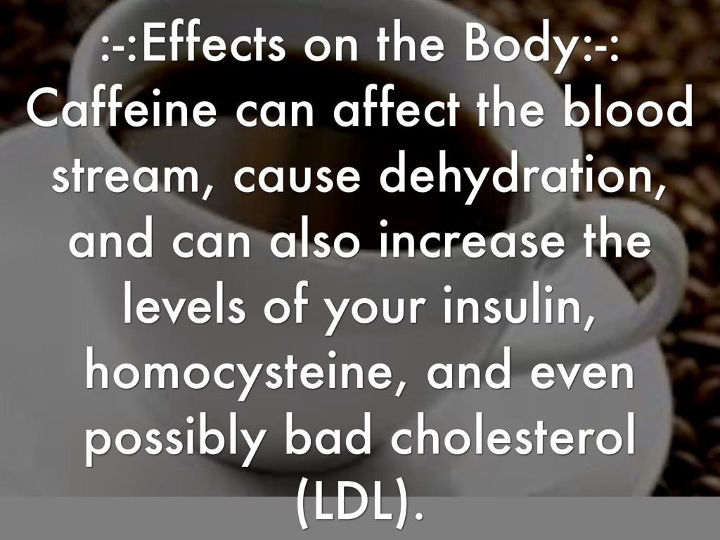 :-:Effects on the Body:-: Caffeine can affect the blood stream, cause dehydration, and can also increase the levels of your insulin, homocysteine, and even possibly bad cholesterol (LDL).