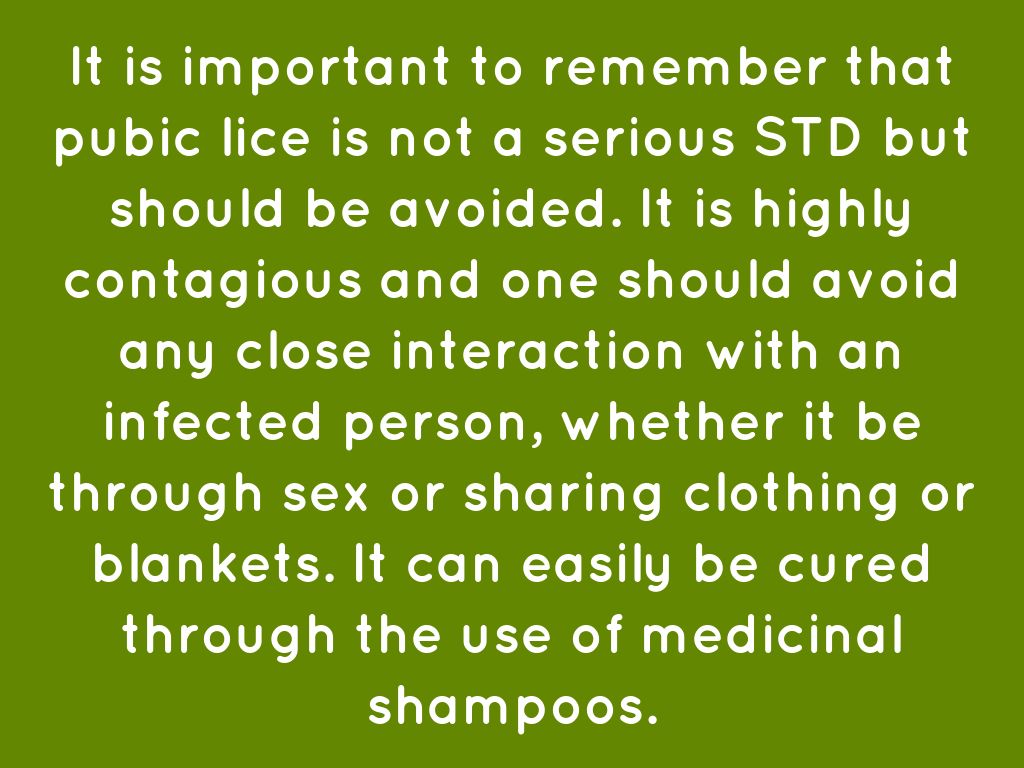 It is important to remember that pubic lice is not a serious STD but should be avoided. It is highly contagious and one should avoid any close interaction with an infected person, whether it be through sex or sharing clothing or blankets. It can easily be cured through the use of medicinal shampoos.