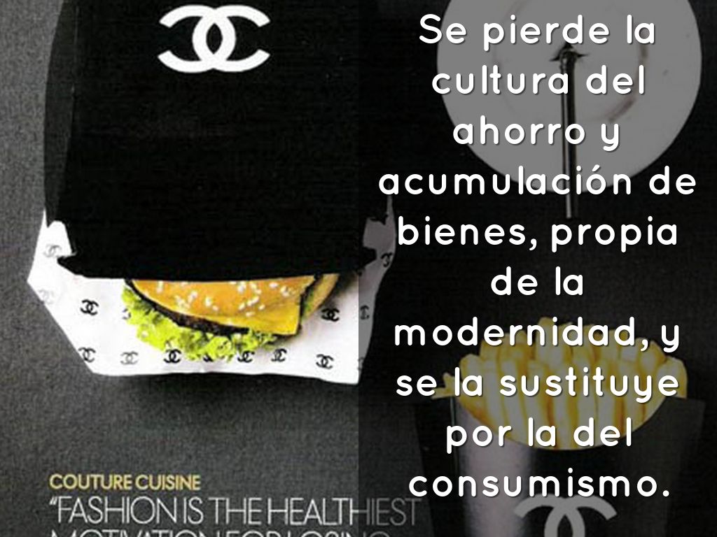 Se pierde la cultura del ahorro y acumulación de bienes, propia de la modernidad, y se la sustituye por la del consumismo.