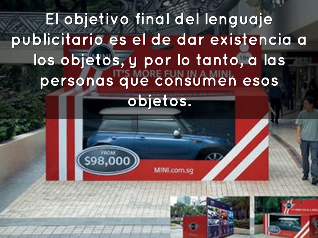 El objetivo final del lenguaje publicitario es el de dar existencia a los objetos, y por lo tanto, a las personas que consumen esos objetos.