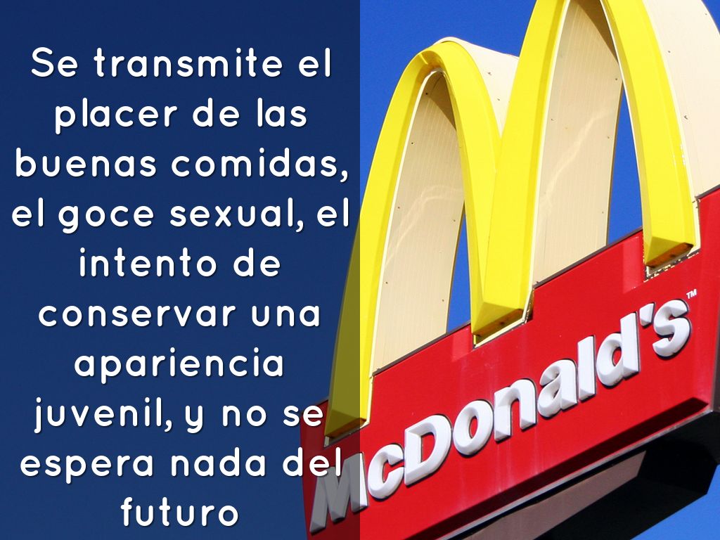 Se transmite el placer de las buenas comidas, el goce sexual, el intento de conservar una apariencia juvenil, y no se espera nada del futuro