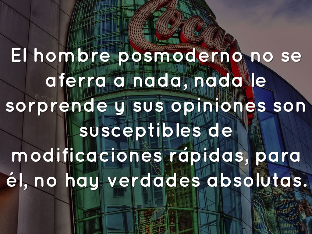 El hombre posmoderno no se aferra a nada, nada le sorprende y sus opiniones son susceptibles de modificaciones rápidas, para él, no hay verdades absolutas.