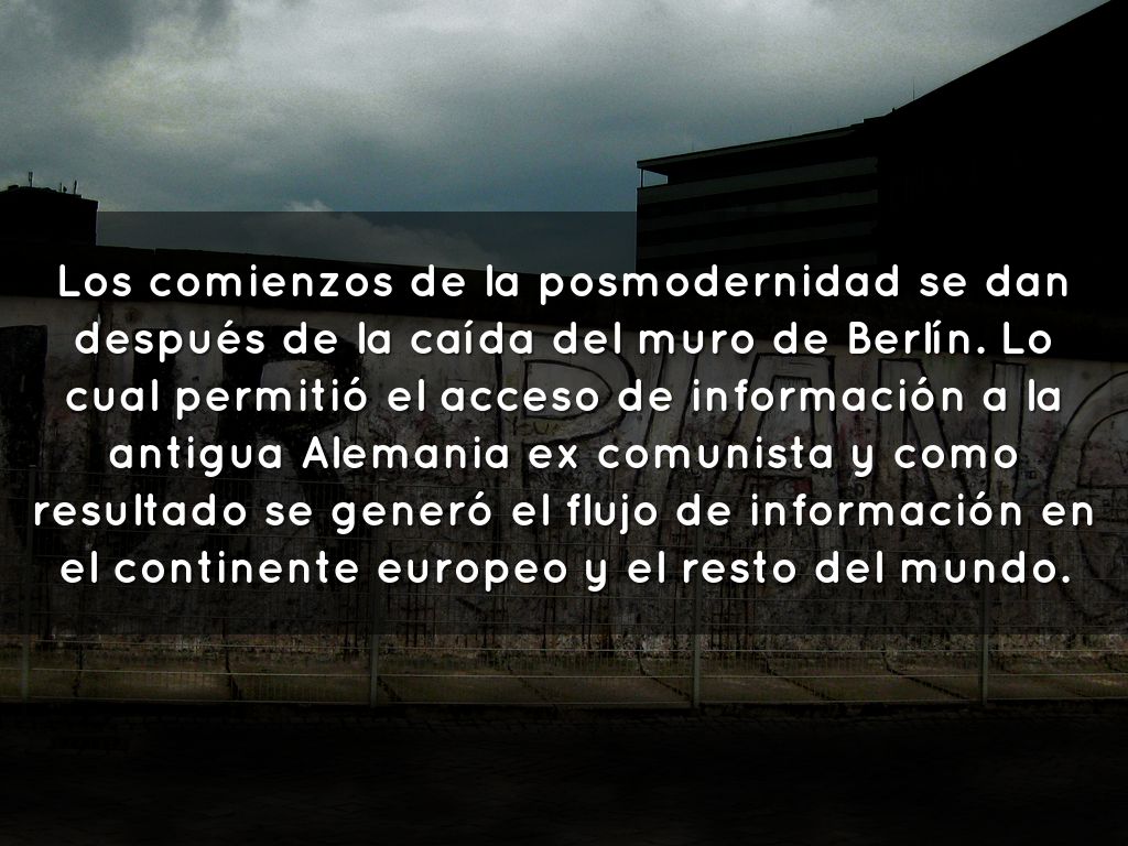 Los comienzos de la posmodernidad se dan después de la caída del muro de Berlín. Lo cual permitió el acceso de información a la antigua Alemania ex comunista y como resultado se generó el flujo de información en el continente europeo y el resto del mundo.
