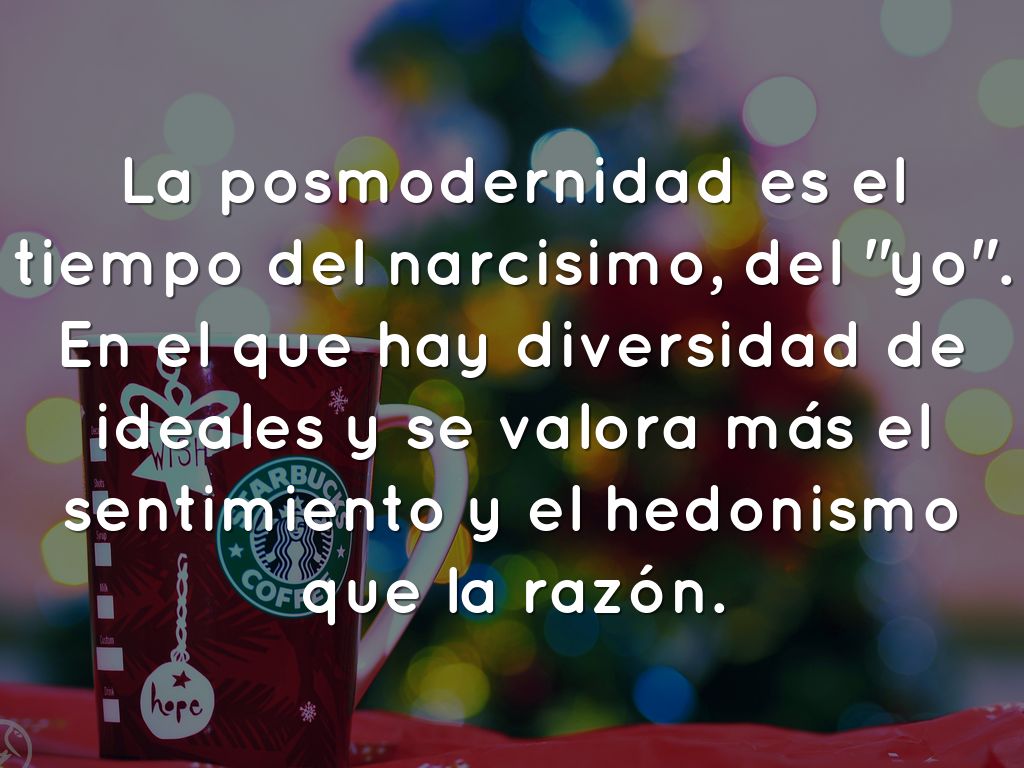 La posmodernidad es el tiempo del narcisimo, del "yo". En el que hay diversidad de ideales y se valora más el sentimiento y el hedonismo que la razón.