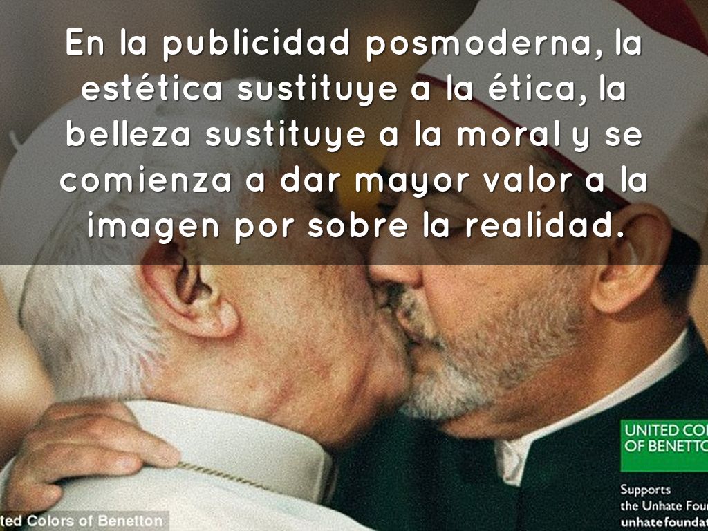 En la publicidad posmoderna, la estética sustituye a la ética, la belleza sustituye a la moral y se comienza a dar mayor valor a la imagen por sobre la realidad.