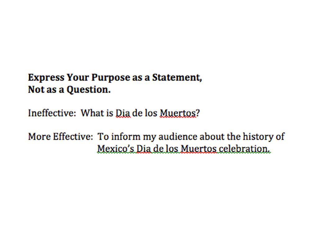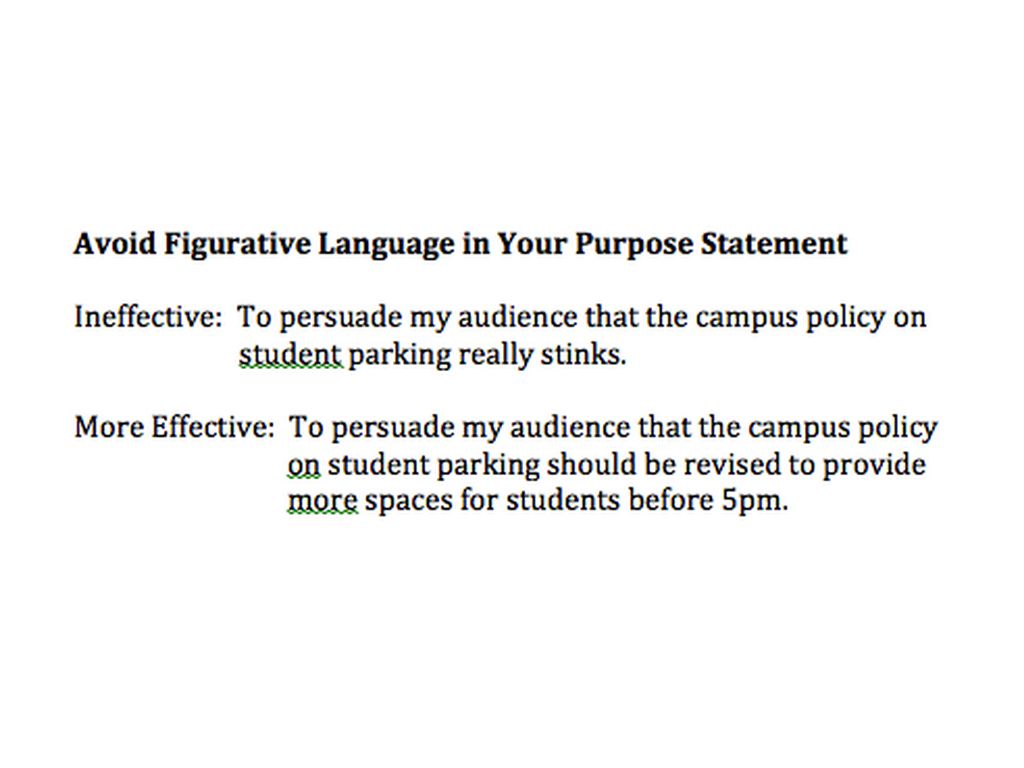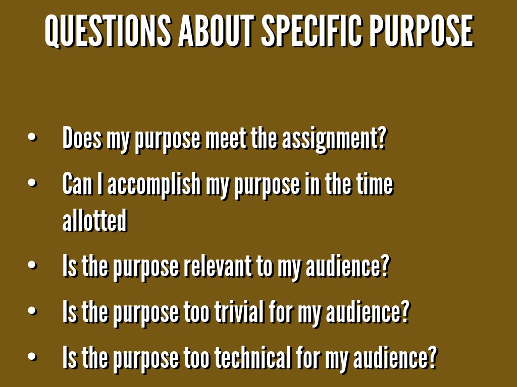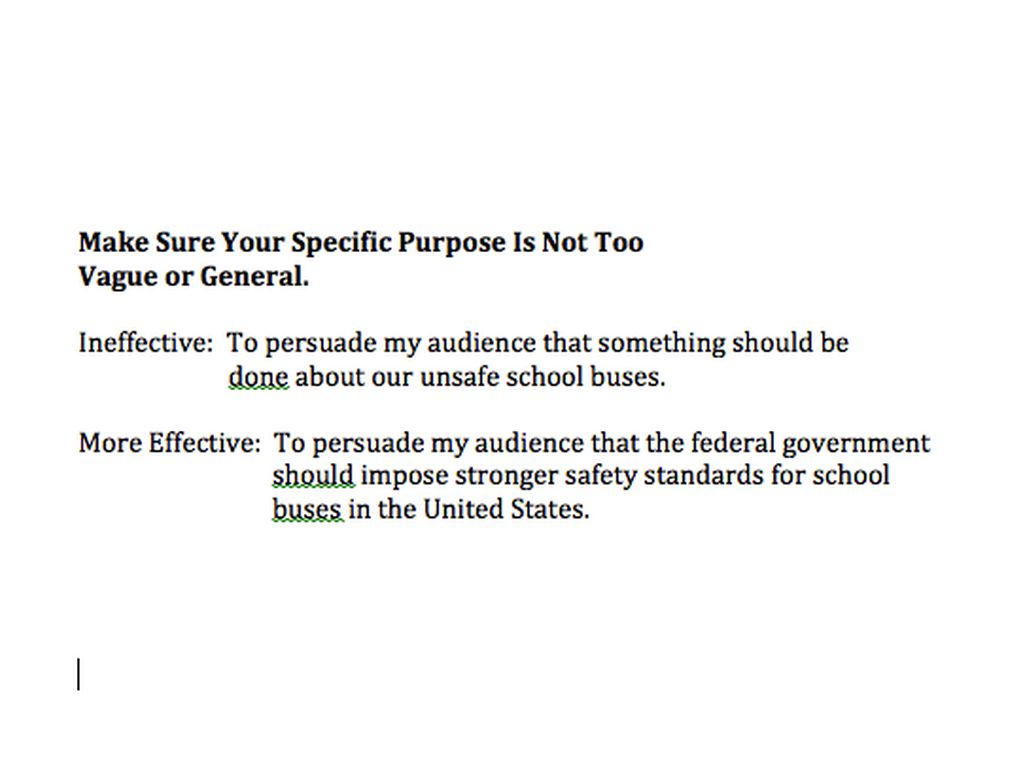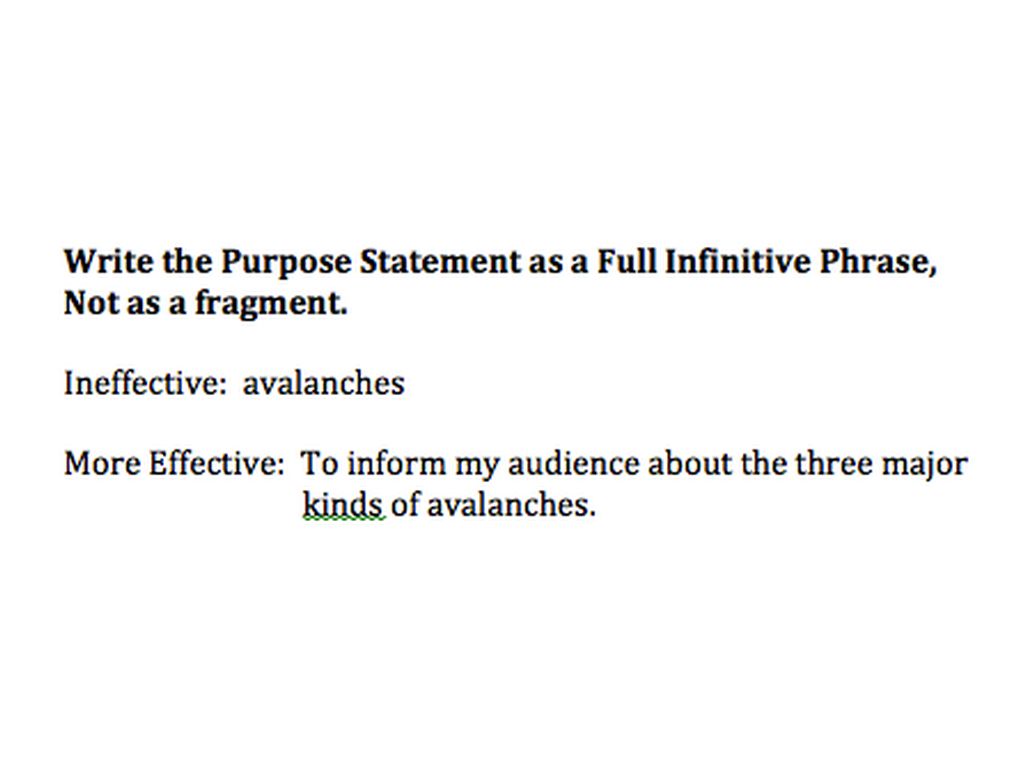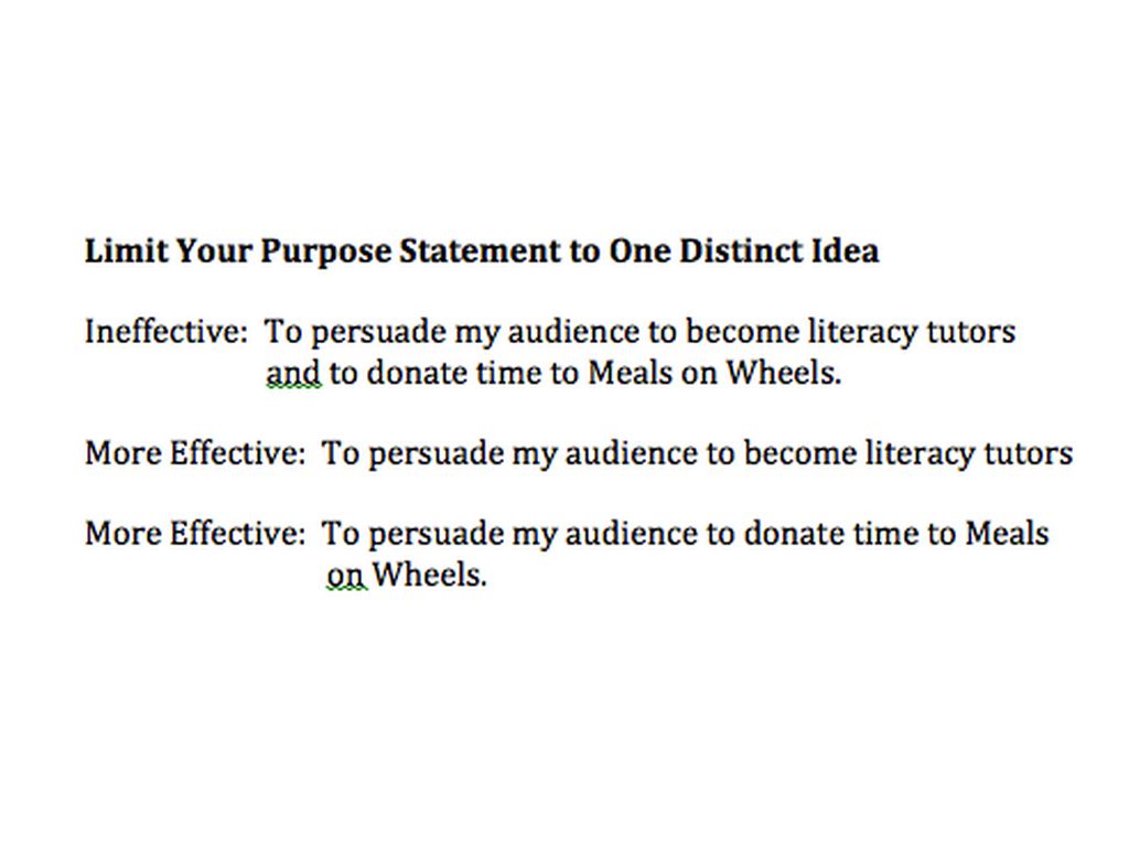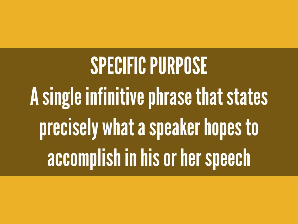 A single infinitive phrase that states precisely what a speaker hopes to accomplish in his or her speech
