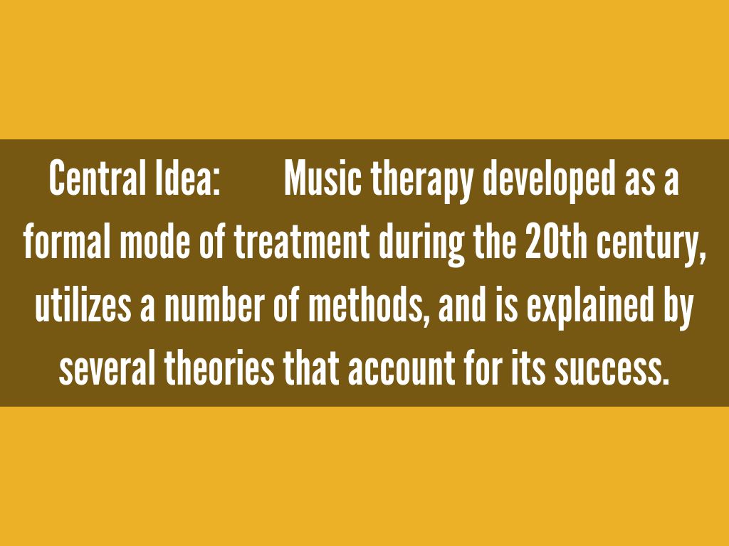 Central Idea: Music therapy developed as a formal mode of treatment during the 20th century, utilizes a number of methods, and is explained by several theories that account for its success.