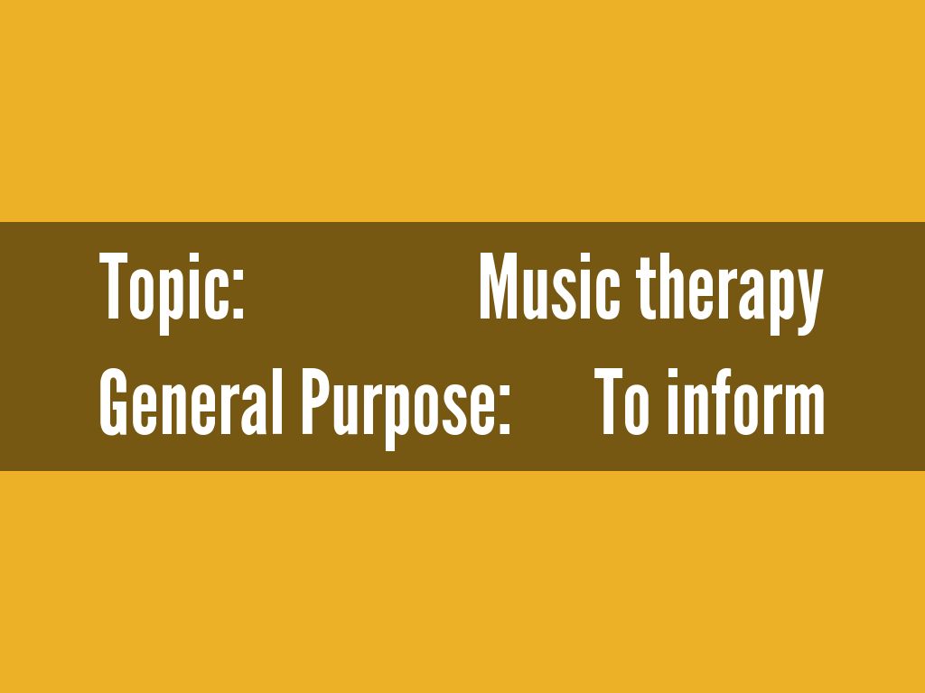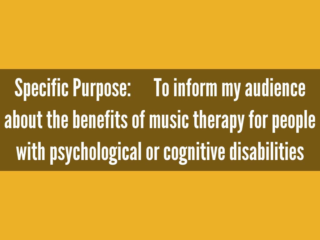 Specific Purpose: To inform my audience about the benefits of music therapy for people with psychological or cognitive disabilities