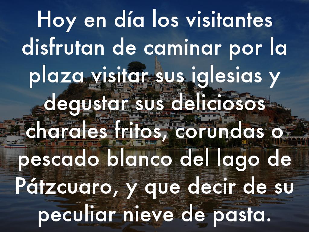 Hoy en día los visitantes disfrutan de caminar por la plaza visitar sus iglesias y degustar sus deliciosos charales fritos, corundas o pescado blanco del lago de Pátzcuaro, y que decir de su peculiar nieve de pasta.