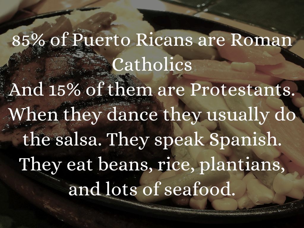 85% of Puerto Ricans are Roman Catholics And 15% of them are Protestants. When they dance they usually do the salsa. They speak Spanish. They eat beans, rice, plantians, and lots of seafood.