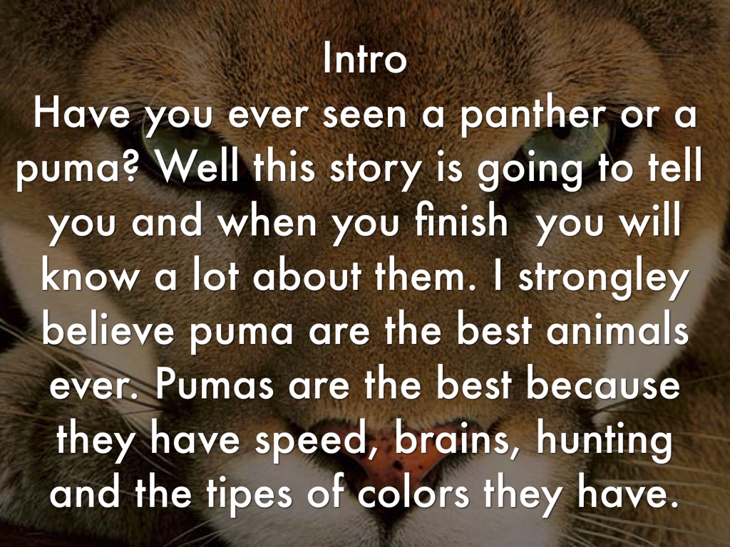 Have you ever seen a panther or a puma? Well this story is going to tell you and when you finish you will know a lot about them. I strongley believe puma are the best animals ever. Pumas are the best because they have speed, brains, hunting and the tipes of colors they have.