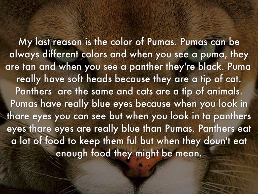 My last reason is the color of Pumas. Pumas can be always different colors and when you see a puma, they are tan and when you see a panther they're black. Puma really have soft heads because they are a tip of cat. Panthers are the same and cats are a tip of animals. Pumas have really blue eyes because when you look in thare eyes you can see but when you look in to panthers eyes thare eyes are really blue than Pumas. Panthers eat a lot of food to keep them ful but when they doun't eat enough food they might be mean.