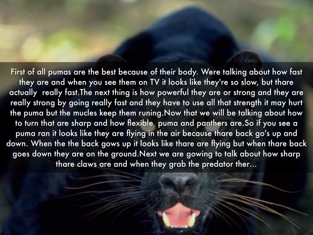First of all pumas are the best because of their body. Were talking about how fast they are and when you see them on TV it looks like they're so slow, but thare actually really fast.The next thing is how powerful they are or strong and they are really strong by going really fast and they have to use all that strength it may hurt the puma but the mucles keep them runing.Now that we will be talking about how to turn that are sharp and how flexible puma and panthers are.So if you see a puma ran it looks like they are flying in the air because thare back go's up and down. When the the back gows up it looks like thare are flying but when thare back goes down they are on the ground.Next we are gowing to talk about how sharp thare claws are and when they grab the predator ther…