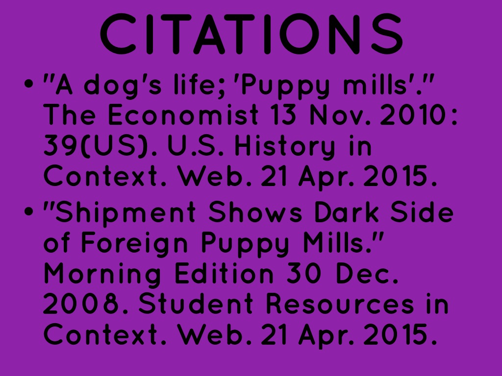 "Shipment Shows Dark Side of Foreign Puppy Mills." Morning Edition 30 Dec. 2008. Student Resources in Context. Web. 21 Apr. 2015.