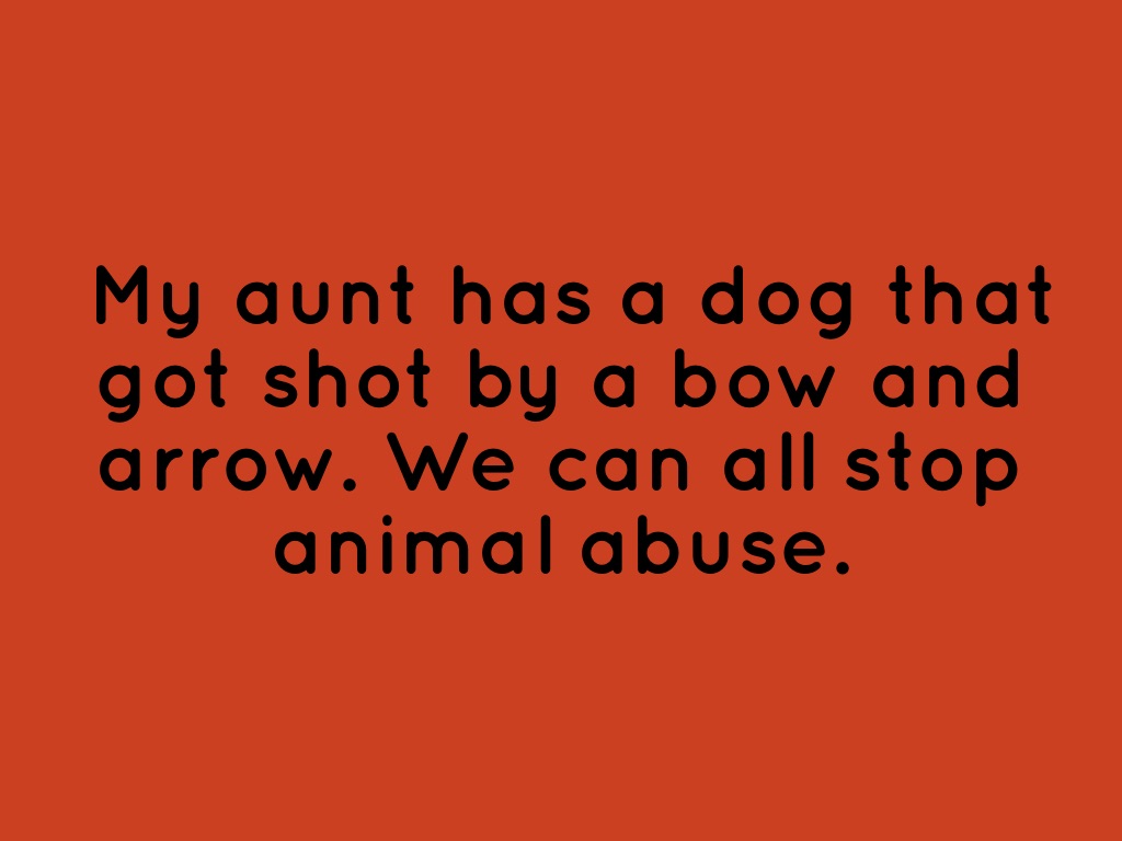 My aunt has a dog that got shot by a bow and arrow. We can all stop animal abuse.