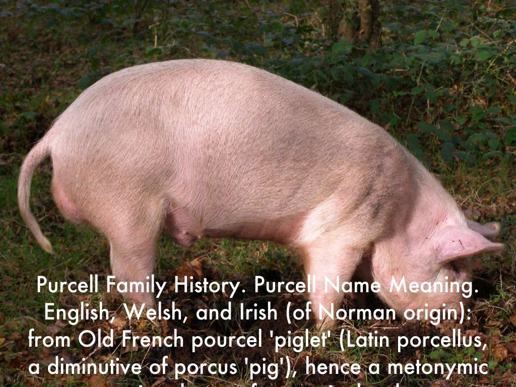 Purcell Family History. Purcell Name Meaning. English, Welsh, and Irish (of Norman origin): from Old French pourcel 'piglet' (Latin porcellus, a diminutive of porcus 'pig'), hence a metonymic occupational name for a swineherd, or a nickname, perhaps affectionate in tone.