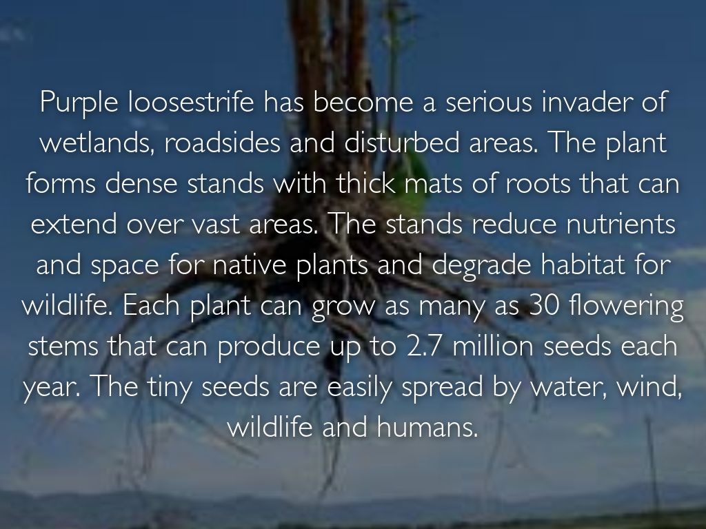 Purple loosestrife has become a serious invader of wetlands, roadsides and disturbed areas. The plant forms dense stands with thick mats of roots that can extend over vast areas. The stands reduce nutrients and space for native plants and degrade habitat for wildlife. Each plant can grow as many as 30 flowering stems that can produce up to 2.7 million seeds each year. The tiny seeds are easily spread by water, wind, wildlife and humans.