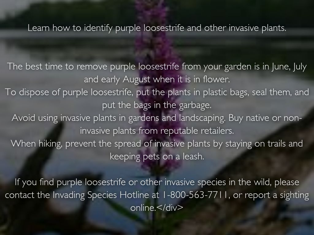 If you find purple loosestrife or other invasive species in the wild, please contact the Invading Species Hotline at 1-800-563-7711, or report a sighting online.