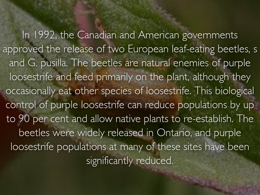 In 1992, the Canadian and American governments approved the release of two European leaf-eating beetles, s and G. pusilla. The beetles are natural enemies of purple loosestrife and feed primarily on the plant, although they occasionally eat other species of loosestrife. This biological control of purple loosestrife can reduce populations by up to 90 per cent and allow native plants to re-establish. The beetles were widely released in Ontario, and purple loosestrife populations at many of these sites have been significantly reduced.