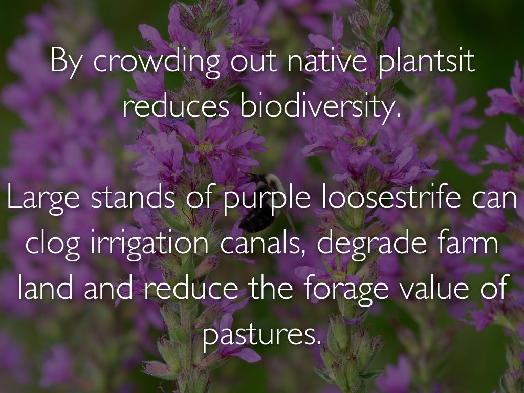 Large stands of purple loosestrife can clog irrigation canals, degrade farm land and reduce the forage value of pastures.