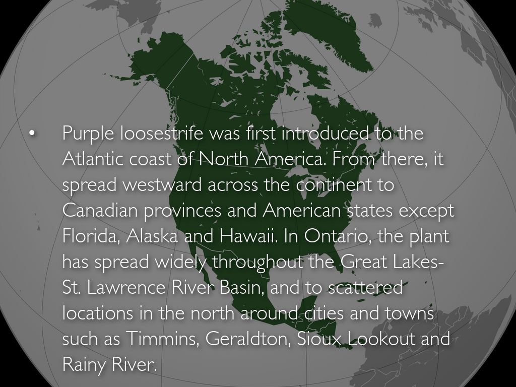 • Purple loosestrife was first introduced to the Atlantic coast of North America. From there, it spread westward across the continent to Canadian provinces and American states except Florida, Alaska and Hawaii. In Ontario, the plant has spread widely throughout the Great Lakes-St. Lawrence River Basin, and to scattered locations in the north around cities and towns such as Timmins, Geraldton, Sioux Lookout and Rainy River.