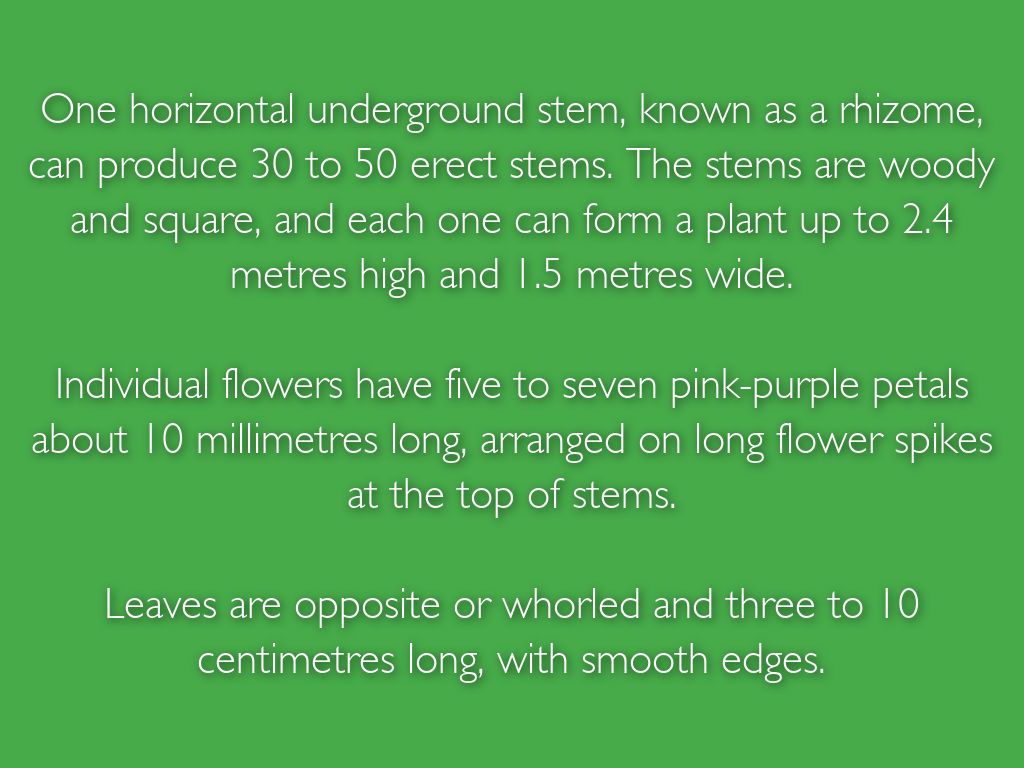 One horizontal underground stem, known as a rhizome, can produce 30 to 50 erect stems. The stems are woody and square, and each one can form a plant up to 2.4 metres high and 1.5 metres wide.