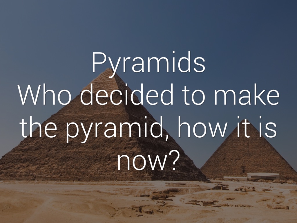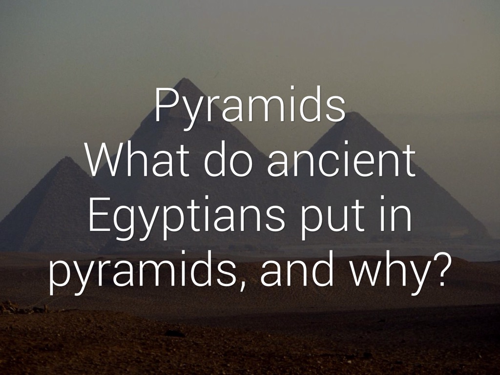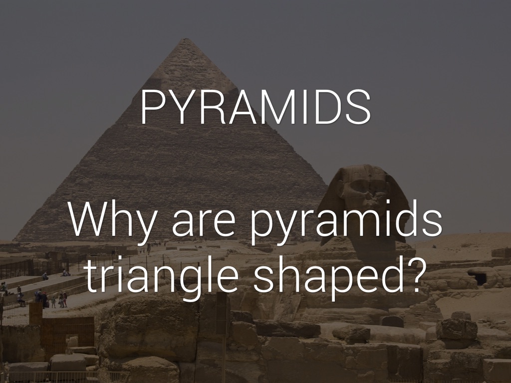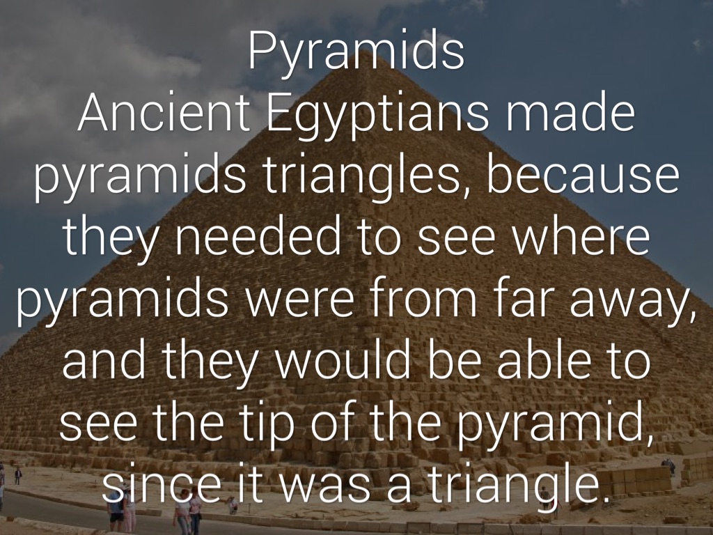 Pyramids Ancient Egyptians made pyramids triangles, because they needed to see where pyramids were from far away, and they would be able to see the tip of the pyramid, since it was a triangle.