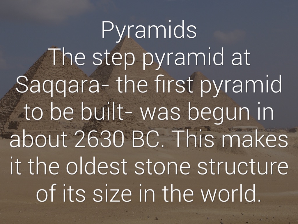 Pyramids The step pyramid at Saqqara- the first pyramid to be built- was begun in about 2630 BC. This makes it the oldest stone structure of its size in the world.