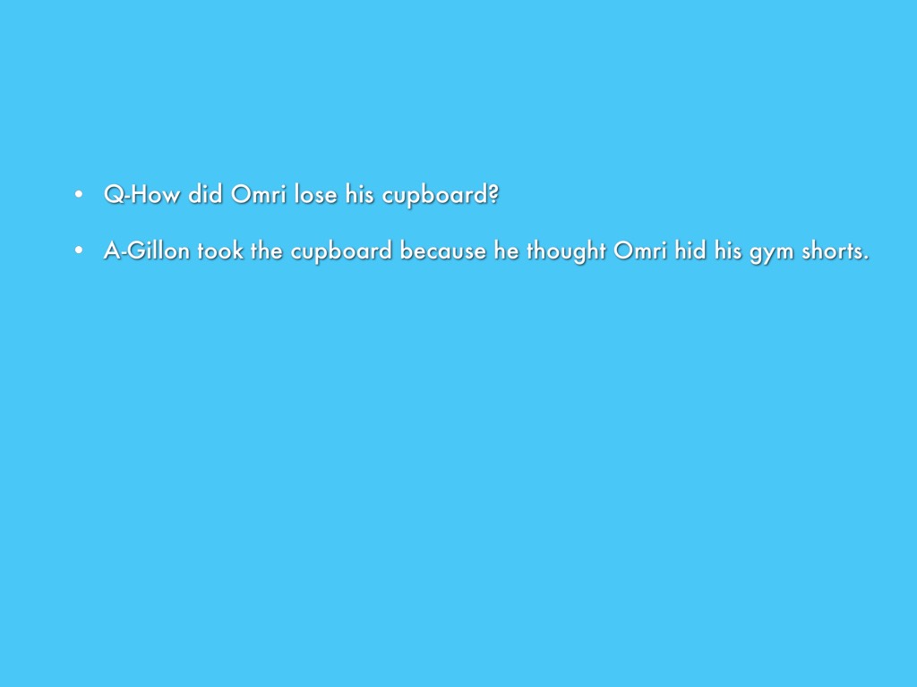 A-Gillon took the cupboard because he thought Omri hid his gym shorts.