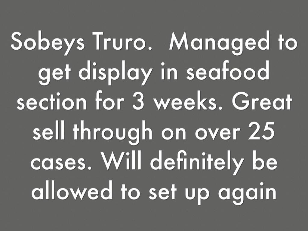 Sobeys Truro. Managed to get display in seafood section for 3 weeks. Great sell through on over 25 cases. Will definitely be allowed to set up again