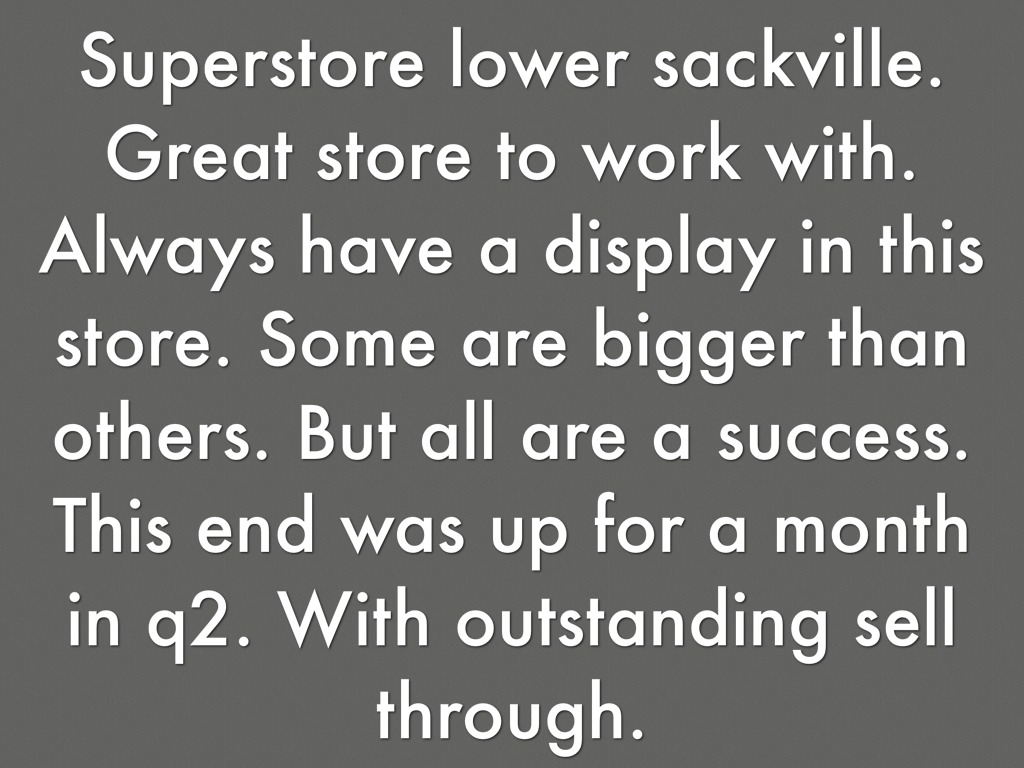 Superstore lower sackville. Great store to work with. Always have a display in this store. Some are bigger than others. But all are a success. This end was up for a month in q2. With outstanding sell through.