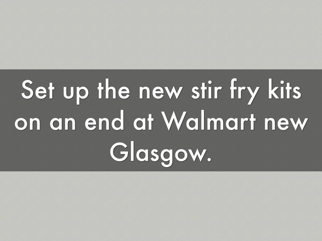 Set up the new stir fry kits on an end at Walmart new Glasgow.
