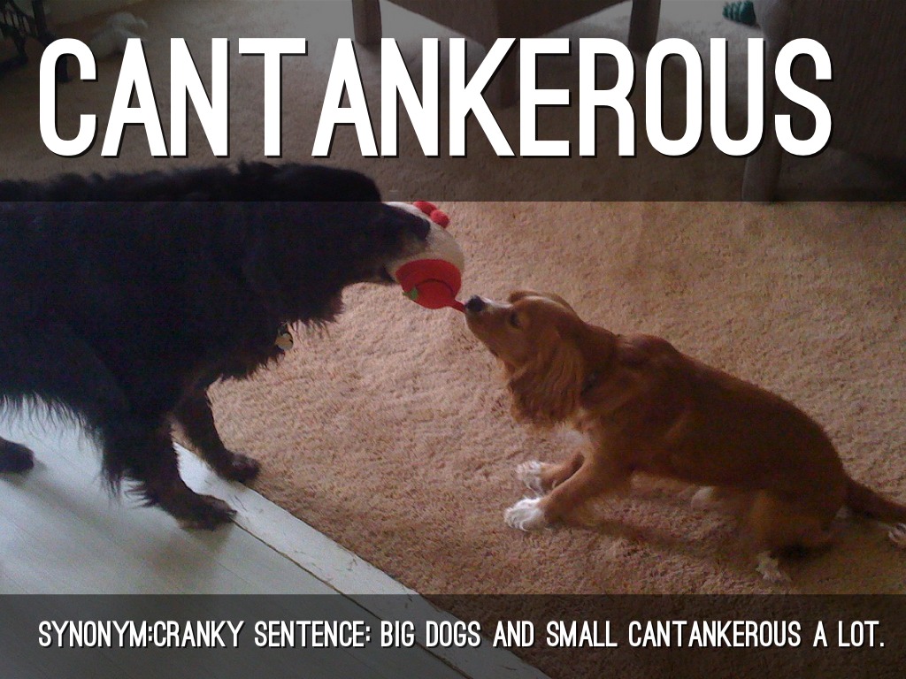 SYNONYM:CRANKY SENTENCE: BIG DOGS AND SMALL CANTANKEROUS A LOT.