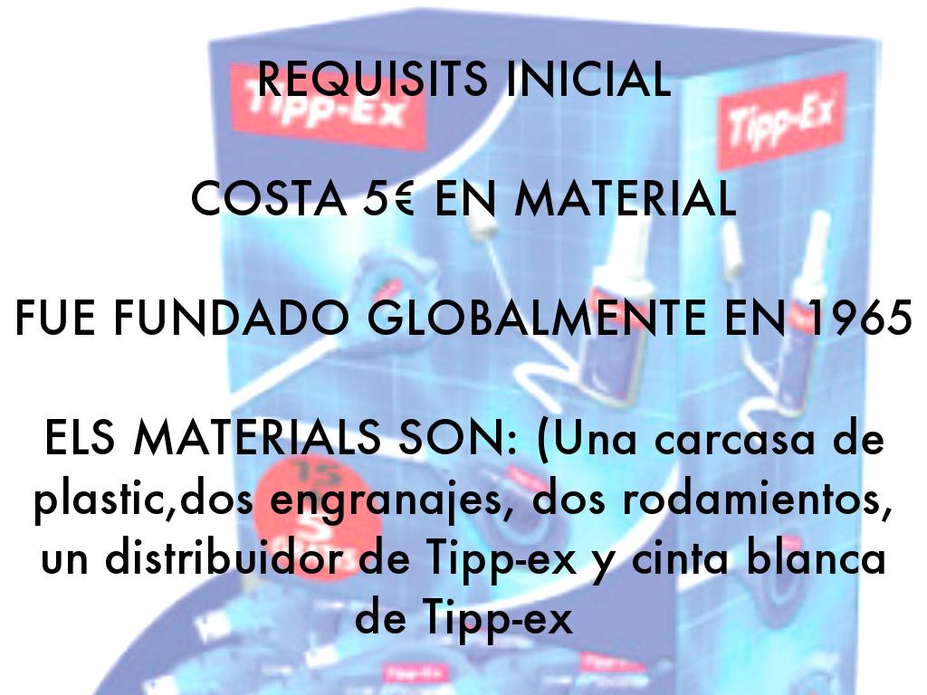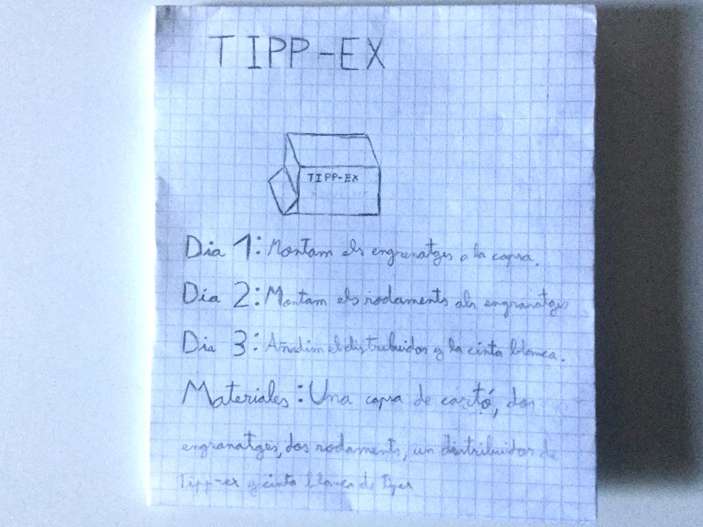 ELS MATERIALS SON: (Una carcasa de plastic,dos engranajes, dos rodamientos, un distribuidor de Tipp-ex y cinta blanca de Tipp-ex