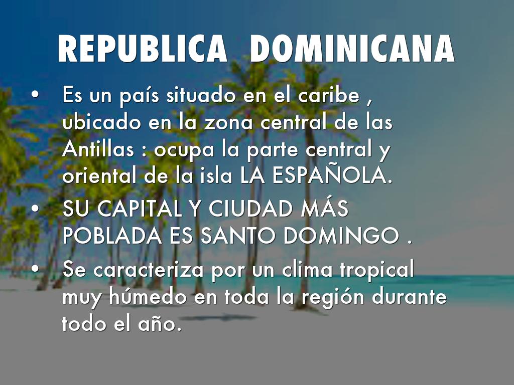 - Es un país situado en el caribe , ubicado en la zona central de las Antillas : ocupa la parte central y oriental de la isla LA ESPAÑOLA.