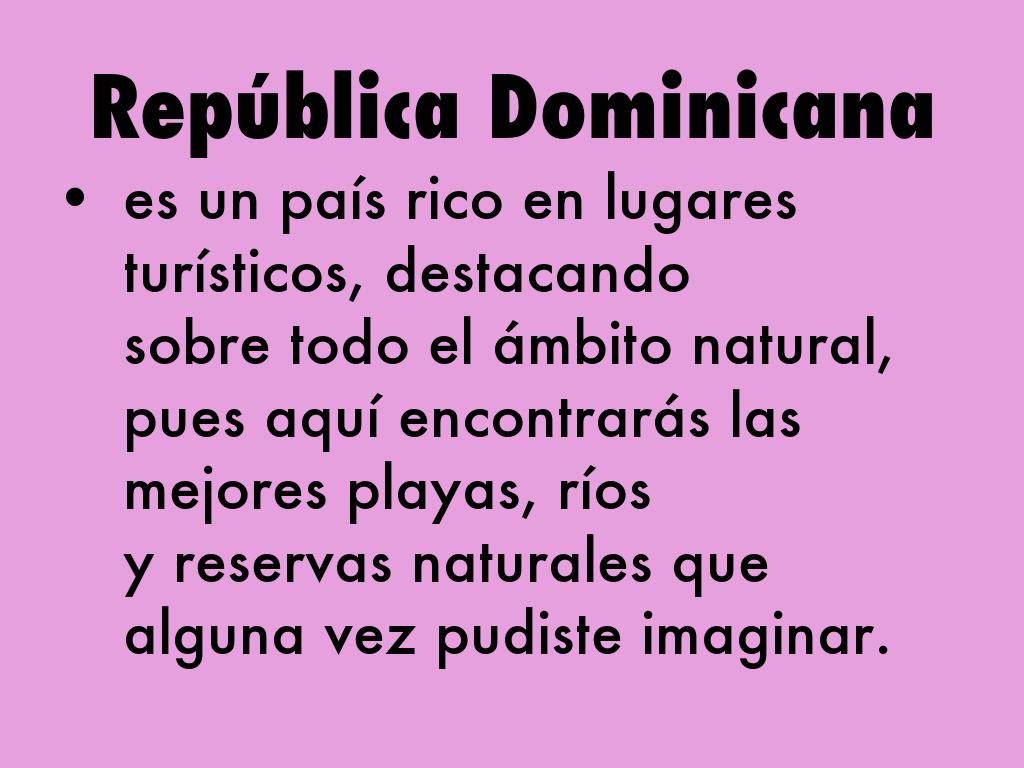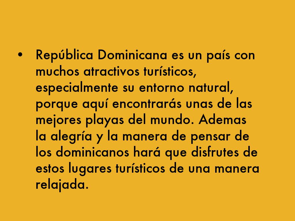 - República Dominicana es un país con muchos atractivos turísticos, especialmente su entorno natural, porque aquí encontrarás unas de las mejores playas del mundo. Ademas la alegría y la manera de pensar de los dominicanos hará que disfrutes de estos lugares turísticos de una manera relajada.