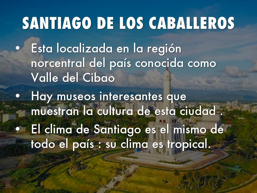 - El clima de Santiago es el mismo de todo el país : su clima es tropical.