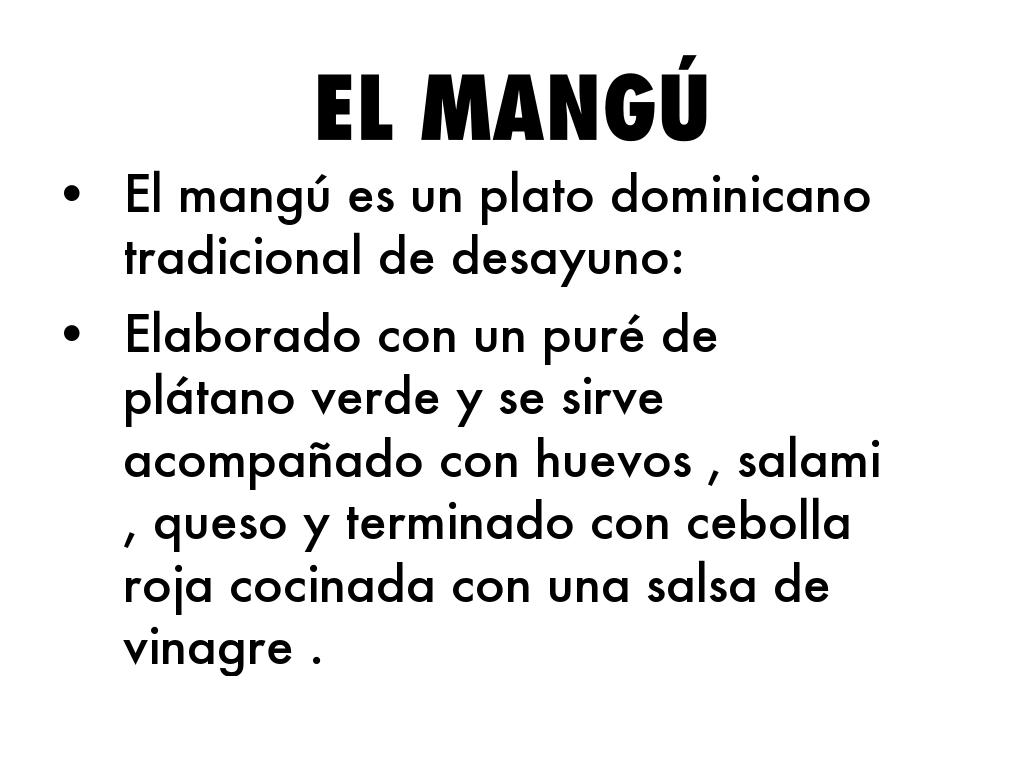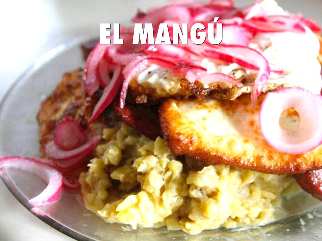 - Elaborado con un puré de plátano verde y se sirve acompañado con huevos , salami , queso y terminado con cebolla roja cocinada con una salsa de vinagre .