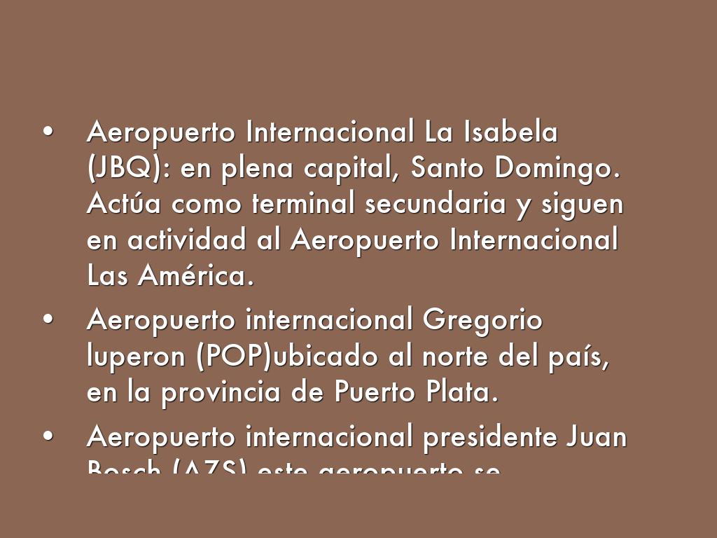 - Aeropuerto Internacional La Isabela (JBQ): en plena capital, Santo Domingo. Actúa como terminal secundaria y siguen en actividad al Aeropuerto Internacional Las América.