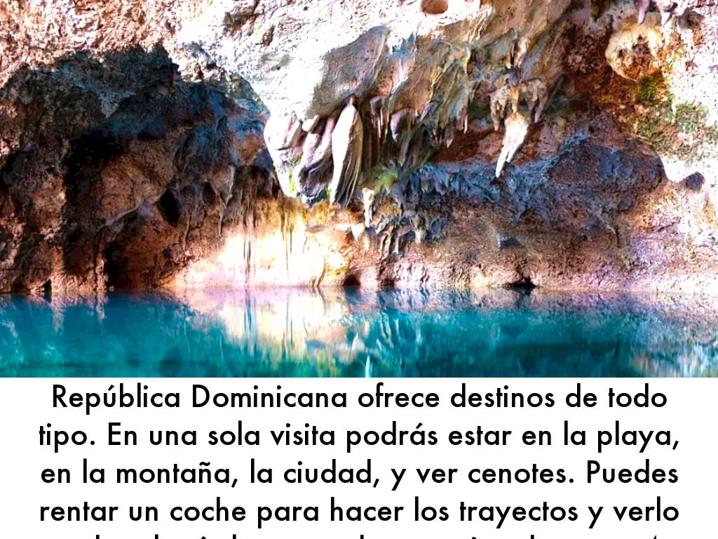 República Dominicana ofrece destinos de todo tipo. En una sola visita podrás estar en la playa, en la montaña, la ciudad, y ver cenotes. Puedes rentar un coche para hacer los trayectos y verlo todo, el más largo es de aproximadamente 4 horas.